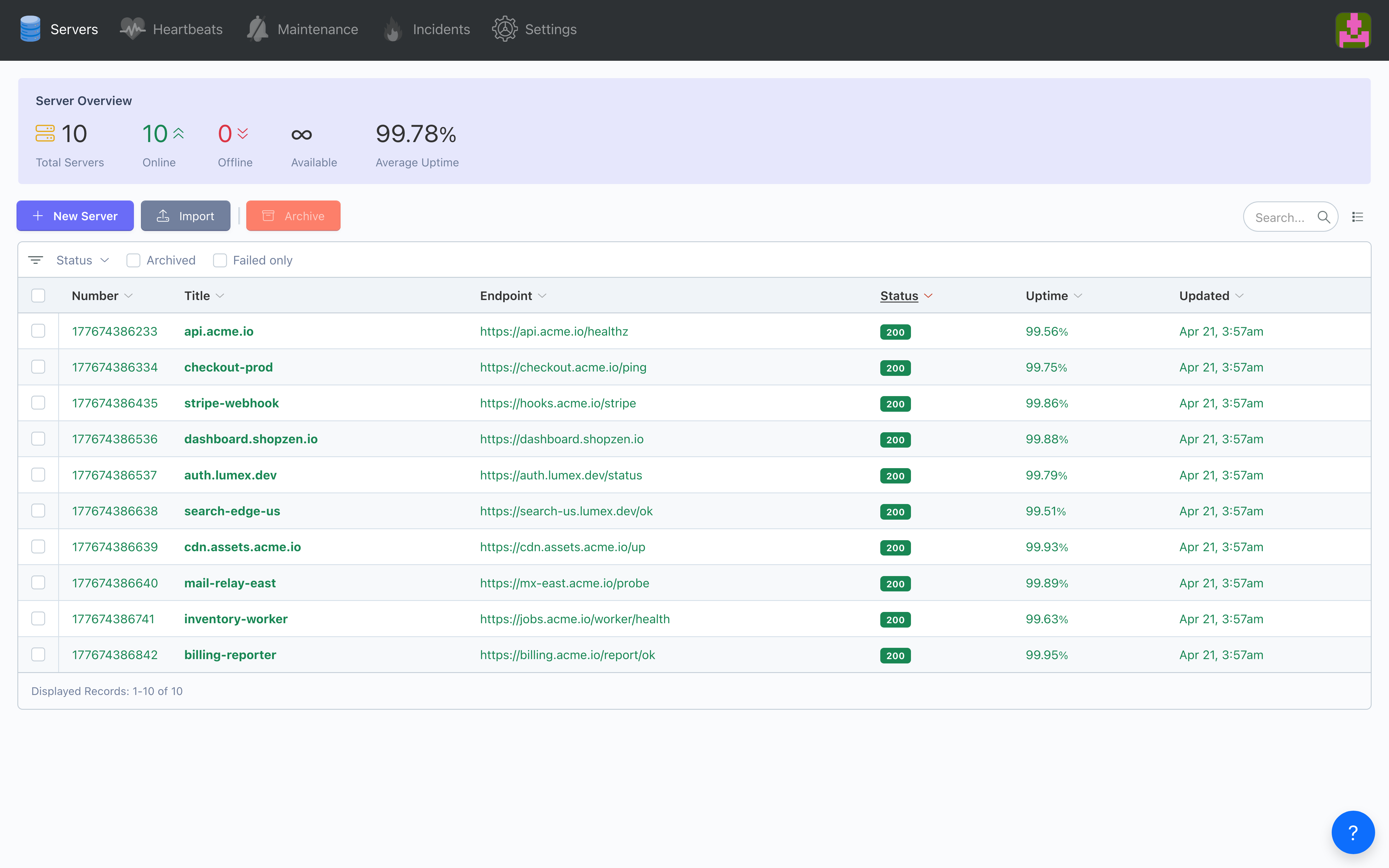 No agents to install. Add HTTP/HTTPS endpoints and we'll monitor uptime, latency, and recovery automatically.